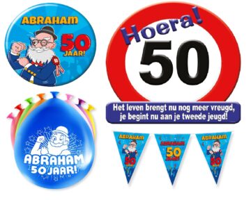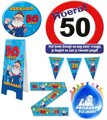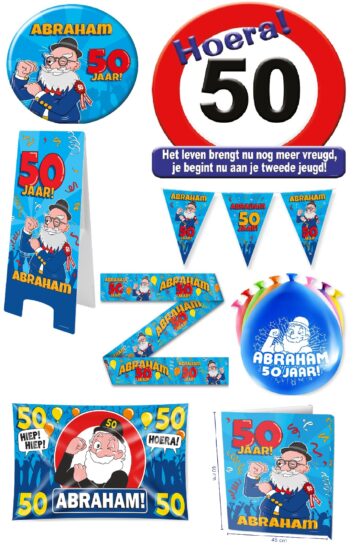 1x huldeschild, 1x speldje Abraham, 1x vlaggenlijn Abraham, 1x 8 ballonnen Abraham, 1x warning sign, 1x partytape