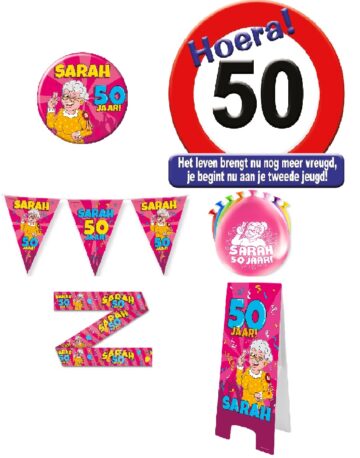 1x huldeschild, 1x speldje Sarah, 1x vlaggenlijn Sarah, 1x 8 ballonnen Sarah, 1x warning sign, 1x partytape