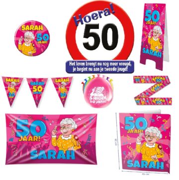 1x huldeschild, 1x speldje Sarah, 1x vlaggenlijn Sarah, 1x 8 ballonnen Sarah