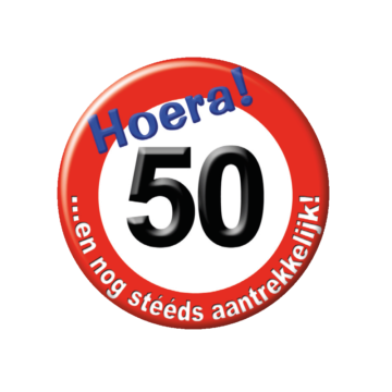 Feestelijke kleine button in verkeersbordstijl met een diameter van 5,5 cm.