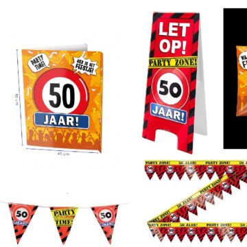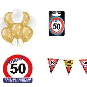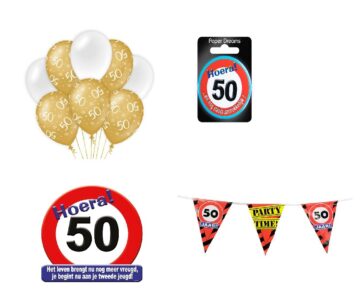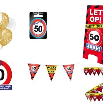 1x Vlaggenlijn van de leeftijd die je kiest 6x ballonnen van de leeftijd die je kiest 1x huldeschild van 50×50 cm van de leeftijd die je kies 1x feestelijke button van 5,5 cm van de leeftijd die je kiest