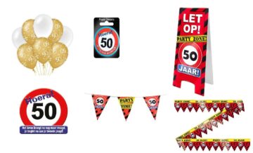 1x Vlaggenlijn van de leeftijd die je kiest 6x ballonnen van de leeftijd die je kiest 1x huldeschild van 50×50 cm van de leeftijd die je kies 1x feestelijke button van 5,5 cm van de leeftijd die je kiest 1x…