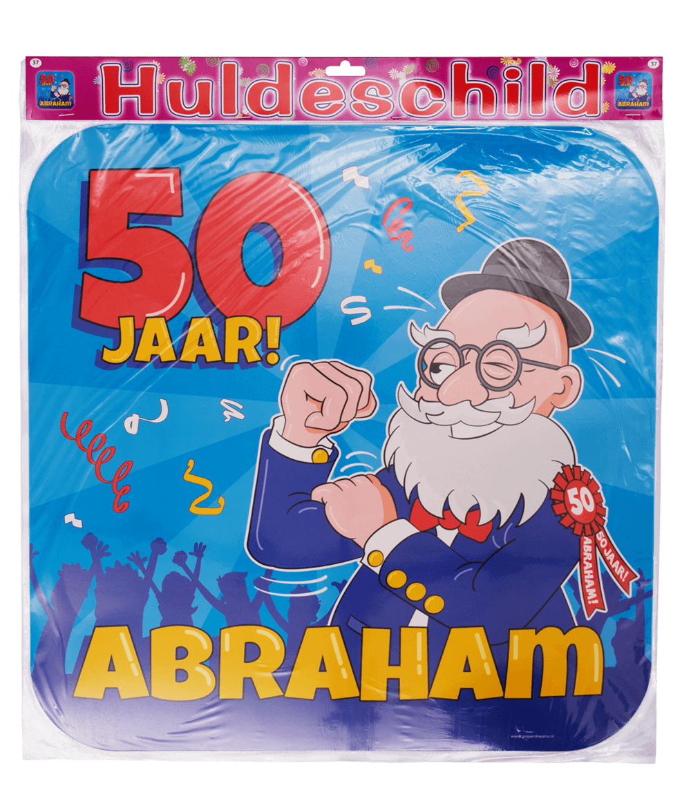 Deze grote huldeschilden zijn met 50 x 50 centimeter de perfecte decoratie aan deuren en ramen. Dit huldeschild met Abraham cartoon is gemaakt van karton met een plastic laagje.