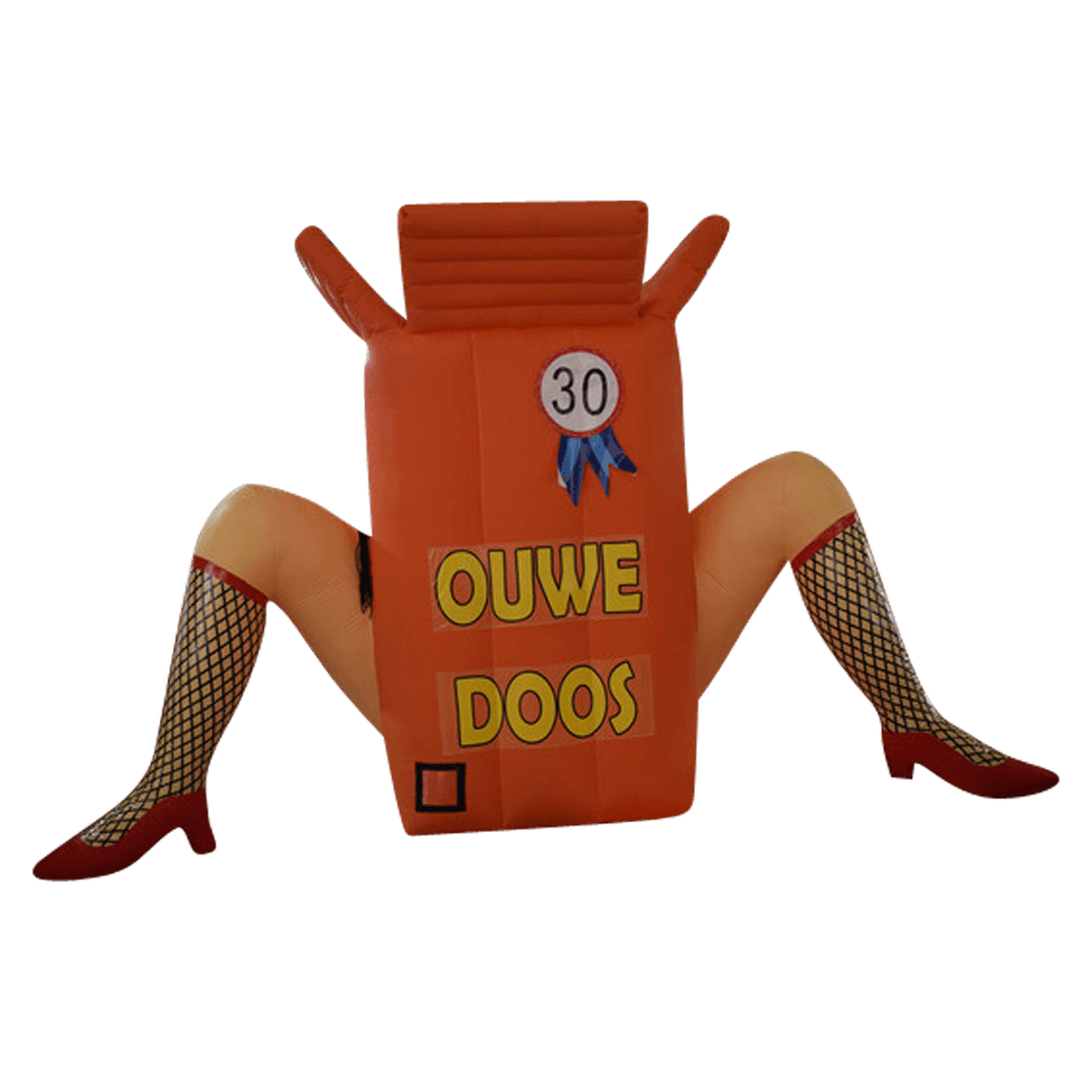Het opzetten van de ouwe doos is super eenvoudig te doen. De pop dient bevestigd te worden aan de meegeleverde pomp. De stekker in het stopcontact en de pomp blaast de Ouwe Doos in 30 seconden helemaal vol. Span nu de meegeleverde en de al aan de pop bevestigde touwen goed vast. Gebruik eventueel de meegeleverde haringen om het goed in de grond te bevestigen. Na een minuut of 10 heb je de Ouwe doos pop volledig staan en is het tijd om de jarige naar buiten te halen. Wat zal ze verrast staan kijken! Lachen, gieren en brullen verzekerd.